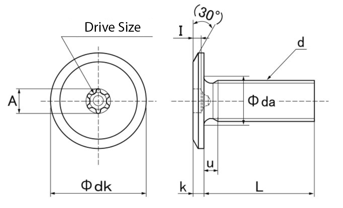 | Thread Nominal (d) | Pitch | Drive Size | A | φdk | k | φda | l | u | |||