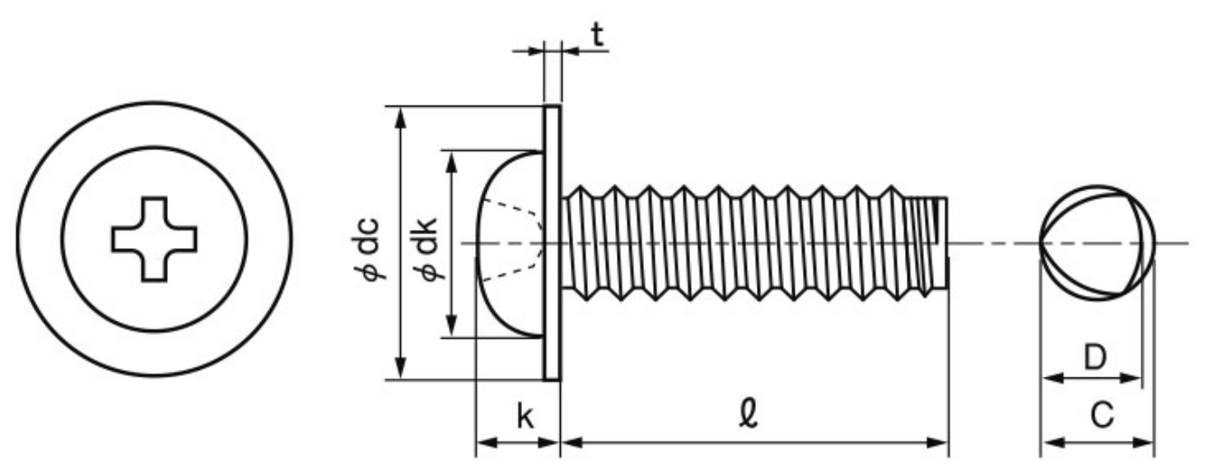| Nominal diameter | Pitch (threads per inch) | dk | dc | k | t Approx. | Cross recess number | Screw diameter | ||||||