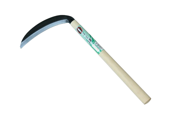 A thin steel sickle with a 180mm blade, designed for cutting soft grass.