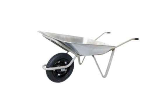 A shallow wheelbarrow for farming, gardening, and landscaping work.