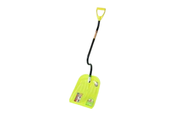 A polycarbonate snow shovel with an S-shaped pipe handle that reduces strain on the back.