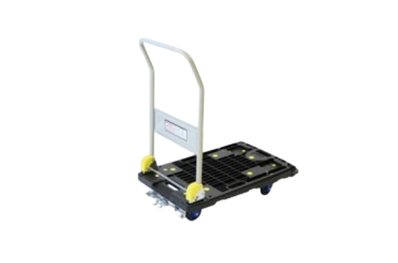A plastic mesh type trolley with silent casters. Equipped with a foot pedal brake.
