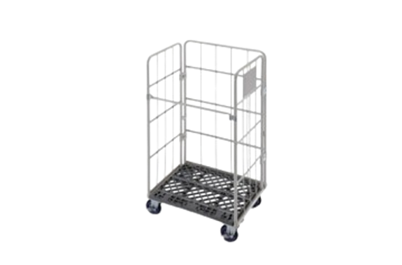 The loading surface is made of resin. The transport cart can be used directly as a display fixture, streamlining, improving the efficiency, and speed of unloading and stocking operations. Load capacity: 500 kg. Features two swivel wheels with stoppers and two fixed wheels.
