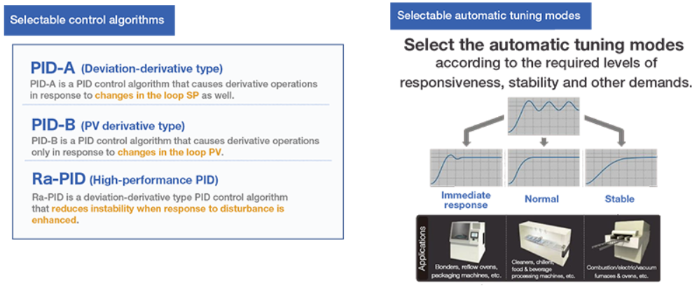 Selectable control algorithms (PID-A、PID-B、RaPID), Three automatic tuning modes, Linear approximation, Zone PID