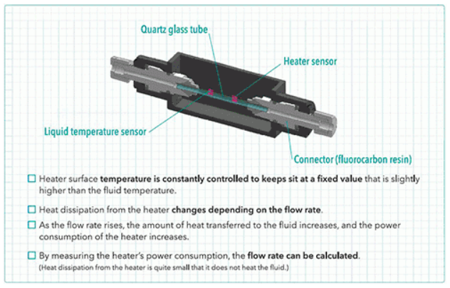 By combining a thermal MEMS sensor and a highly corrosion-resistant quartz glass flow path, the product can measure micro flow rates liquid flow of under 50 mL/min with a high degree of repeatability, which would be a difficult for traditional measurement methods.