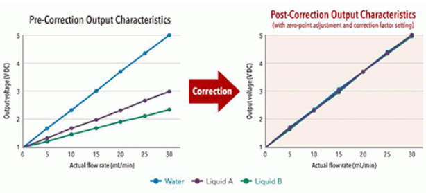 The measurable range varies according to the thermal conductivity of the fluid, but the output characteristics can be adjusted by using the correction function. (See the conceptual diagrams below.)