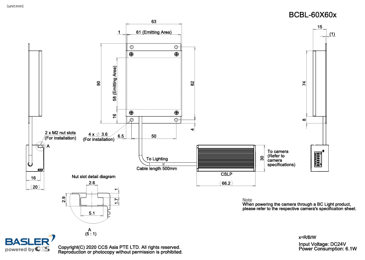 • BCBL-60X60x (x=W, R, B) plug-and-play bar light connects to Basler ace U and ace L camera models.