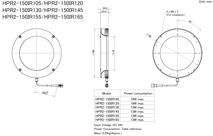 - Ring-type infrared illumination HPR2-150IR120 with an outer diameter of 166 mm, an inner diameter of 116 mm, a height of 26.4 mm, and a peak wavelength of 1200 nm.