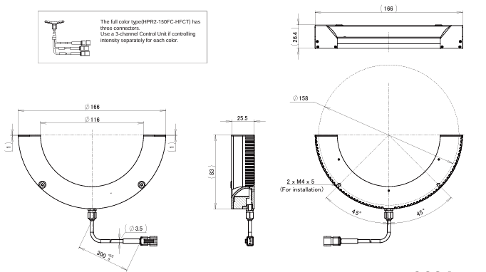 - HPR2-HFCT Series half ring light with outer diameter 166 mm.