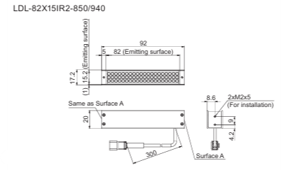 • This Light Unit adopts LEDs with a peak wavelength of 850 nm and measures 92 x 17.2 x 20 mm (width x depth x height).