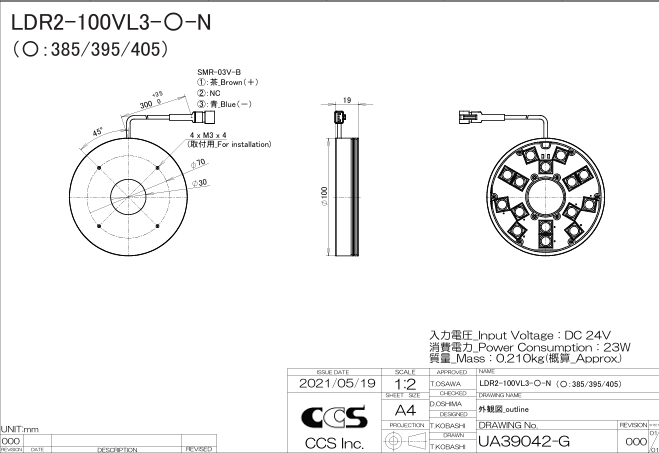 | Conformed standards | CE, UKCA, RoHS IEC 62471 LDR2-100VL3-405-N: High risk LDR2-100VL3-405-W: High risk |