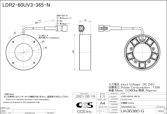 | Dimensions | LDR2-60UV3-365-N: Outer diameter 60 mm, Inner diameter 30 mm, Height 19 mm LDR2-60UV3-365-W: Outer diameter 60 mm, Inner diameter 30 mm, Height 15 mm |