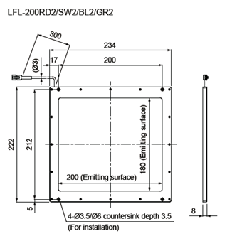• The light-emitting surface measures 180 x 200 mm.