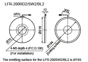 • This Light Unit emits white light and has an outer diameter of 216 mm, an inner diameter of 70 mm, a height of 12 mm, and a light-emitting surface diameter of 193 mm.