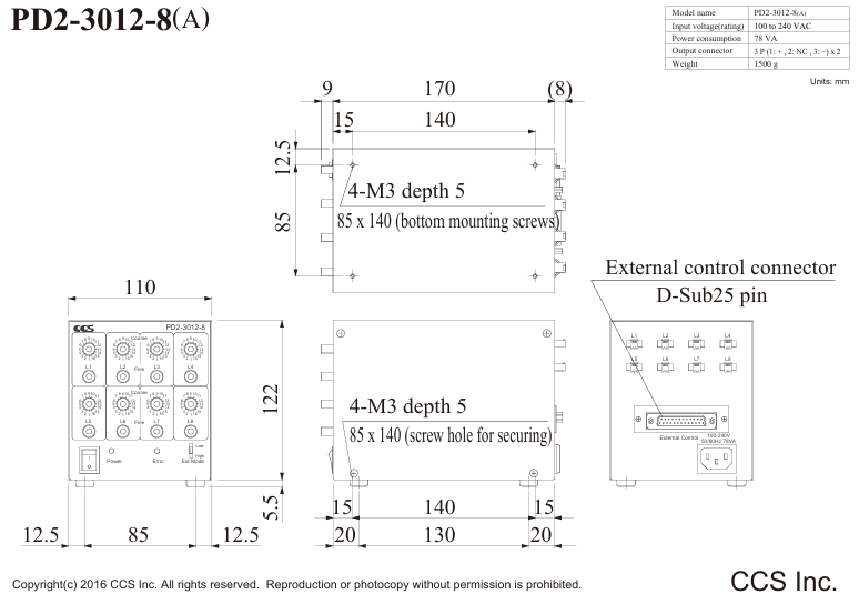 • It operates on a 100 to 240 VAC input and measures 110 x 170 x 122 mm (width x depth x height).