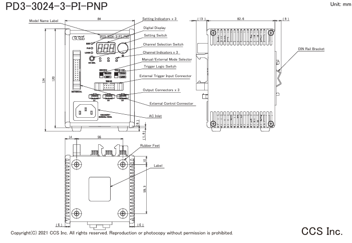 • This Control Unit operates on a 100 to 240 VAC input and measures 84 x 82.6 x 120 mm (width x depth x height).