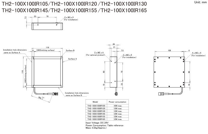 - Flat infrared illumination TH2-100X100IR165 with a width of 116 mm x depth of 116 mm x height of 26 mm, a light emitting surface of 100 mm x 100 mm, and a peak wavelength of 1650 nm.