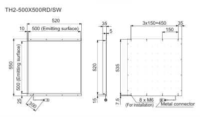 - This Light Unit emits red light and measures 520 x 550 x 35 mm (width x depth x height).