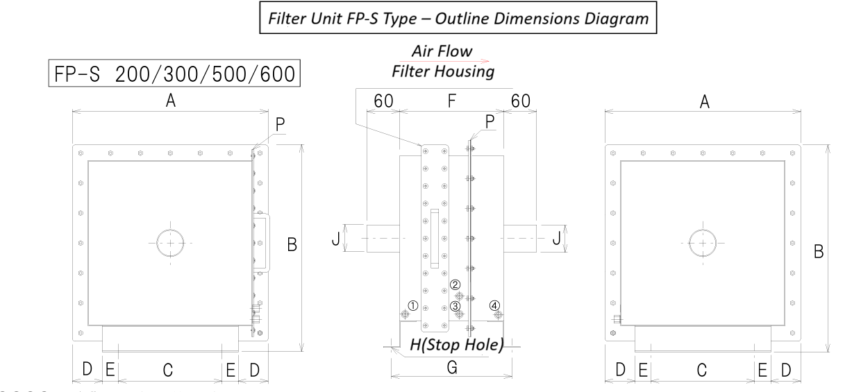 | FP-S-600 | 710 | 730 | 400 | 105 | 50 | 350 | 410 | 4-Φ9L18 | Φ100~200 | 22.3m3/min. |