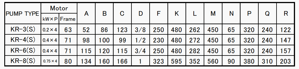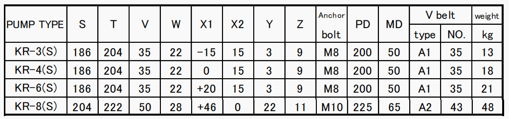 PUMP Size table