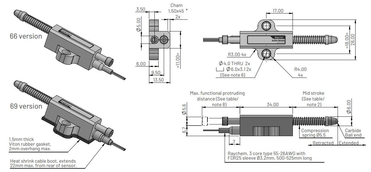 ■ Dimensions for MHL1213 – Sprung shaft, 5mm to 25mm measurement range