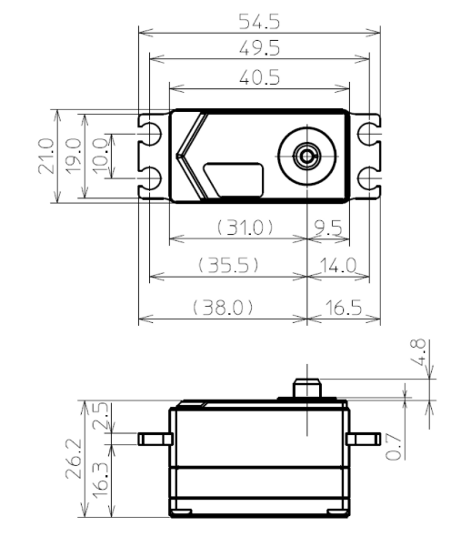 Speed: 0.045 sec / 60° (7.4 V); 0.05 sec/60° (6.6 V)