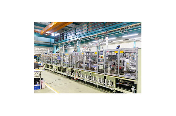 This is a line that manufactures sensors that detect the amount of depression on automobile brake pedals. Each process, from assembling parts to inspecting and boxing finished products, operates in a fully automated manner.