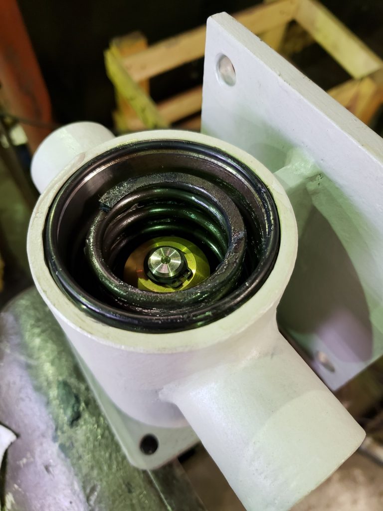 Install the front cover with the valve and insert the spring that determines the switching weight.