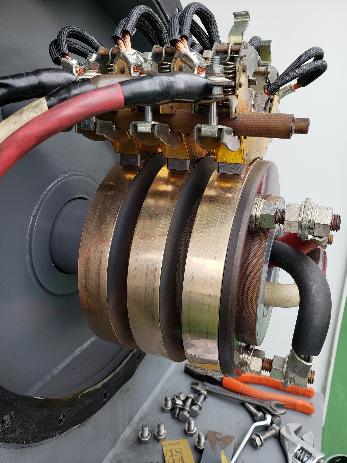 Each ring has two carbon brushes for electrical contact, capable of carrying up to 200A.