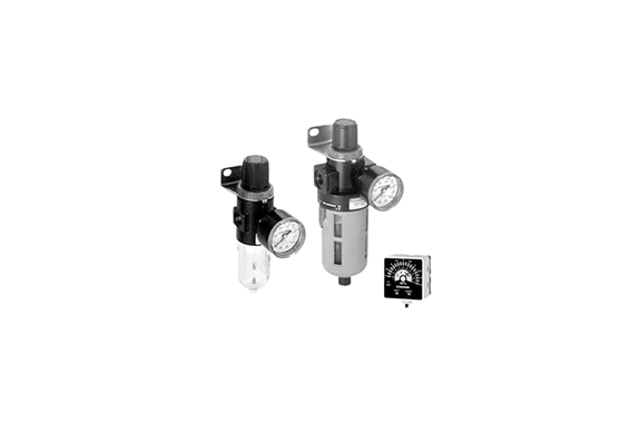 The filter regulators, including models like FR150, FR300, and FR600, are highly efficient and offer great versatility. They combine a 5µm air filter and a compact regulator into a single body. Additionally, these regulators come with a pressure gauge that includes a preset marker as a standard feature. Furthermore, there are low-pressure models available, along with versions that have a built-in check mechanism. To enhance usability, the series also offers optional drain cock fittings, along with auto-drain type drain cocks for added convenience.