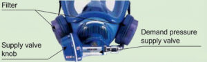 The pressure demand type airline mask is structured to supply the necessary amount of air according to the breathing rhythm, while maintaining positive pressure (pressure higher than ambient air) inside the mask regardless of whether inhaling or exhaling. Therefore, in the worst-case scenario where a gap occurs between the mask and the face, air will blow out from inside the mask, helping to prevent the ingress of outside air and allowing for safer work.