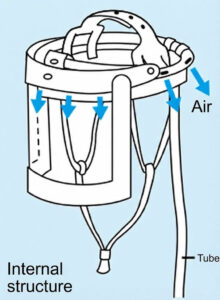 The pressure demand type airline mask is designed to supply the necessary amount of air according to the breathing rhythm, while maintaining positive pressure (pressure higher than ambient air) inside the mask regardless of whether inhaling or exhaling. Therefore, in the worst-case scenario where a gap occurs between the mask and the face, air will blow out from inside the mask, helping to prevent the ingress of outside air and allowing for safer work.