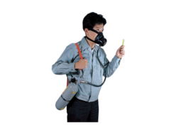 - Because the air is supplied from the cylinder carried by the user, the range of movement is not restricted like airline masks, allowing use over a wide area. (However, the usage time will be limited by the amount of air in the cylinder).
