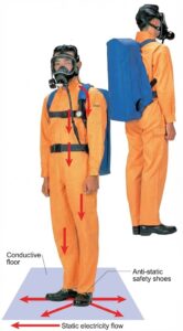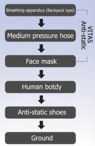 Static electricity generated on the breathing apparatus due to friction, etc., is conducted through the mask to the human body and released to the ground through the feet (anti-static shoes). Please use this product as a safety measure when working in environments with a risk of fire/explosion or in workplaces that require countermeasures against static electricity.