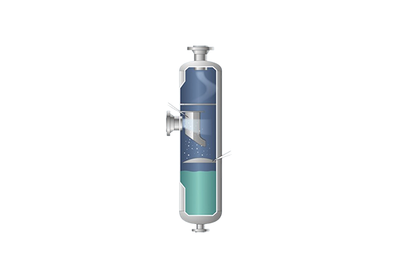 When gas containing mist enters the separator, the vortex baffle creates centrifugal force that drives the mist and solids downward toward the inner wall of the vessel, and this motion allows the system to separate them efficiently. Below the vortex baffle, the dish-shaped baffle then sustains the swirling motion and also blocks any liquid in the pool from re-entering the gas stream. After that, the purified gas turns upward and finally exits through the outlet nozzle.