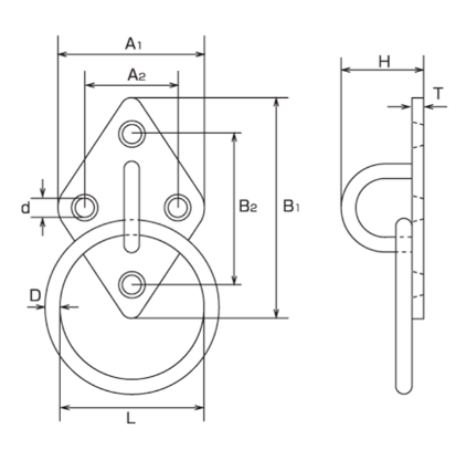 | Model | D | L | A1 | A2 | B1 | B2 | H | d | T | Weight (kg) | Reference Load (kgf) | Reference Load (kN) |