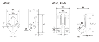 | Product Number | L1 | L2 | H | W1 | W2 | S | R | d | d2 | T | t | Weight (g) | Reference Load (kgf) | Reference Load (kN) |