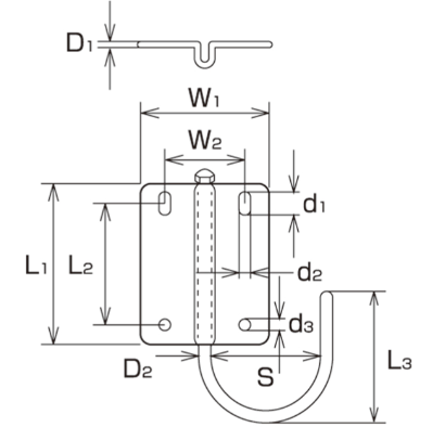 | Product Number | D1 | L1 | L2 | W1 | W2 | d1 | d2 | d3 | D2 | L3 | S | Weight (g) | Reference Load (kgf) | Reference Load (kN) |