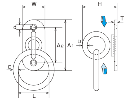 | Model | D | L | A1 | A2 | W | H | T | d | Weight (g) | Reference Load (kgf) | Reference Load (kN) |