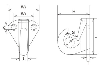 | Model | L | H | W1 | W2 | S | R | d | T | t | Weight (g) | Reference Load (kgf) | Reference Load (kN) |