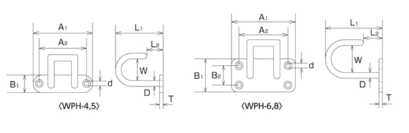 | Model | D | L1 | L2 | W | A1 | A2 | B1 | B2 | d | T | Weight (g) | Reference Load (kgf) | Reference Load (kN) |