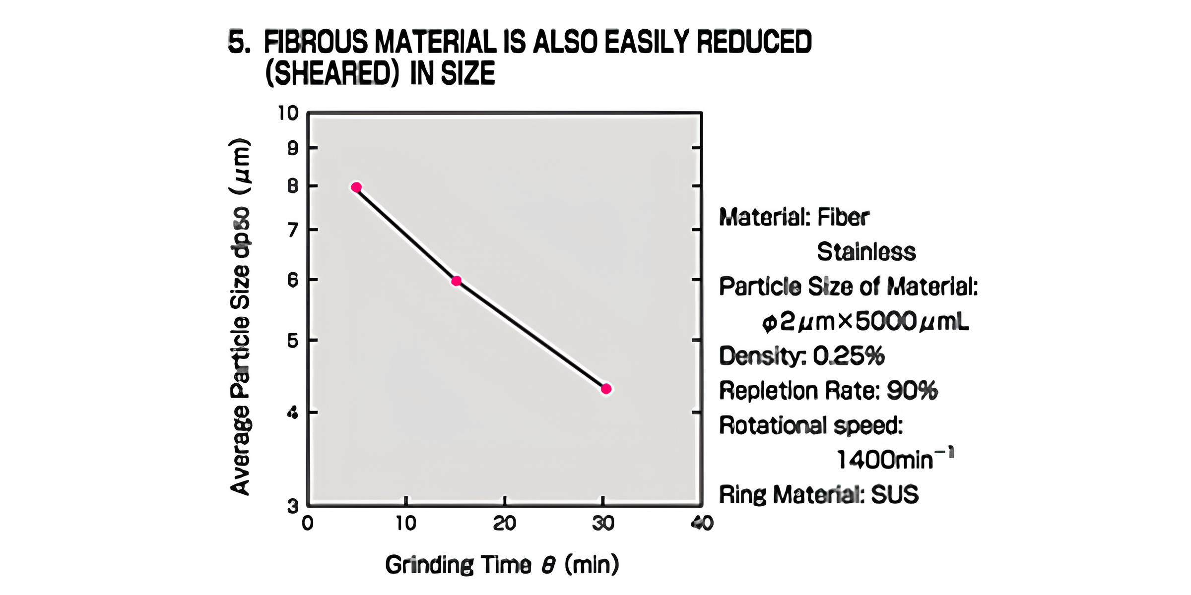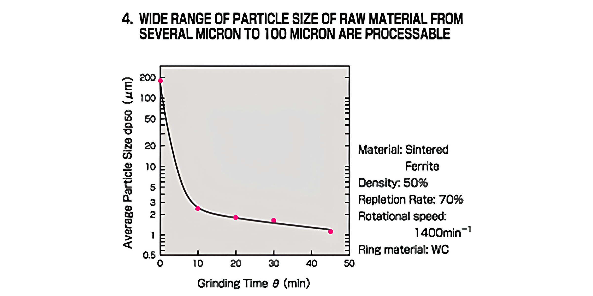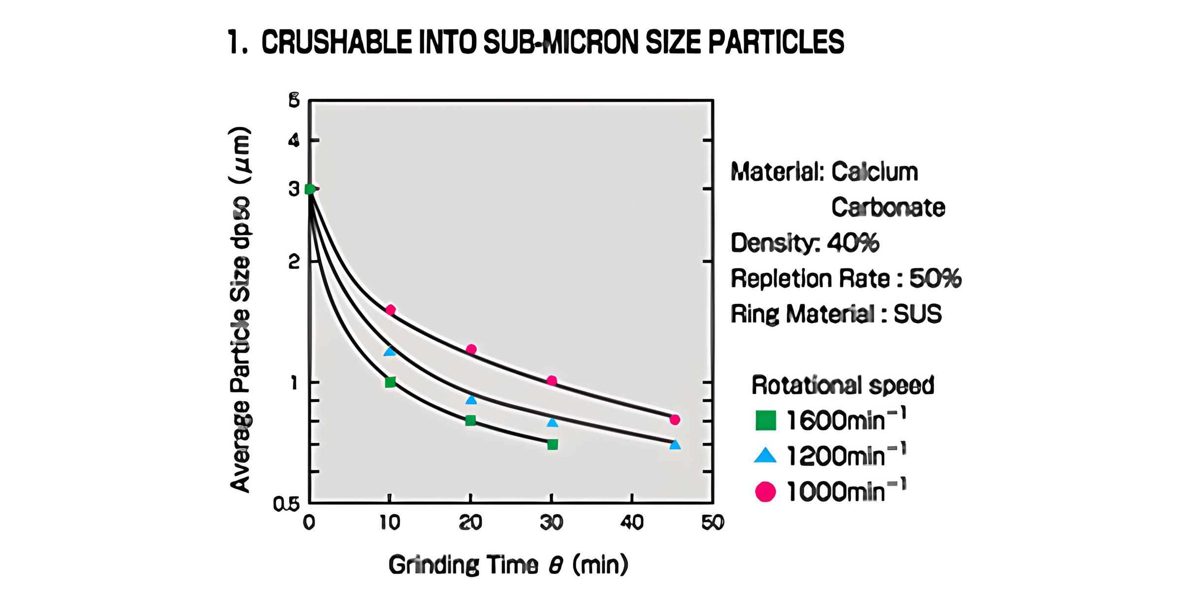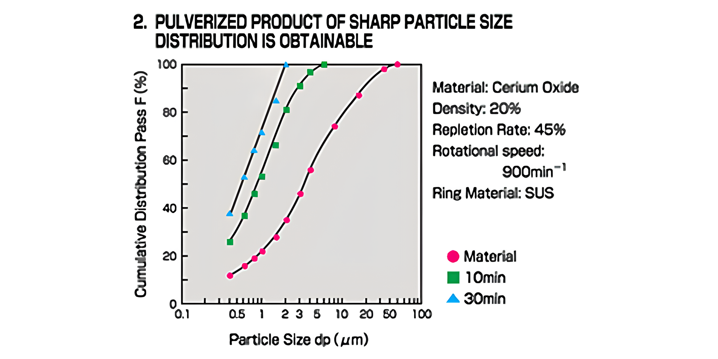 - Fine milling in a short processing time compared to ball mill or beads mill is possible.