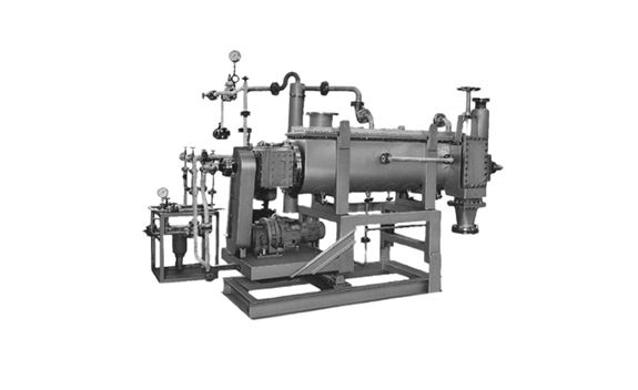 - It has a large heat transfer area per unit volume. It secures a heat transfer area equivalent to that of a paddle dryer by optimizing the shape of disk or pitch. This allows to take up less space for equipment installation.