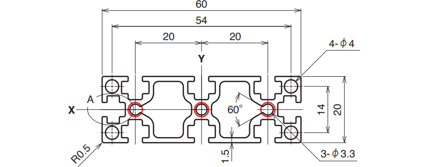 | 6,000 mm | 15–4,000 mm | A6063S-T5 (205) | 225 N/mm² | 403.8 mm² | 1.090 kg/m | Ix 1.74 × 10⁴ mm⁴ Iy 13.9 × 10⁴ mm⁴ |
