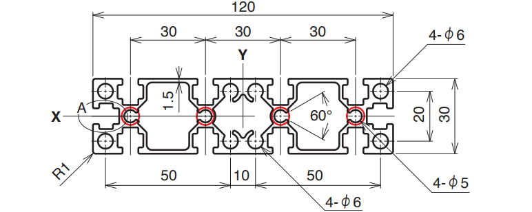 | 6,000 mm | 15–4,000 mm | A6063S-T5 (205) | 225 N/mm² | 1061.9 mm² | 2.867 kg/m | Ix 11.6 × 10⁴ mm⁴ Iy 156.2 × 10⁴ mm⁴ |