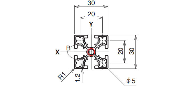 | 6,000 mm | 15–4,000 mm | A6063S-T5 (205) | 225 N/mm² | 280.8 mm² | 0.758 kg/m | Ix 2.53 × 10⁴ mm⁴ Iy 2.53× 10⁴ mm⁴ |