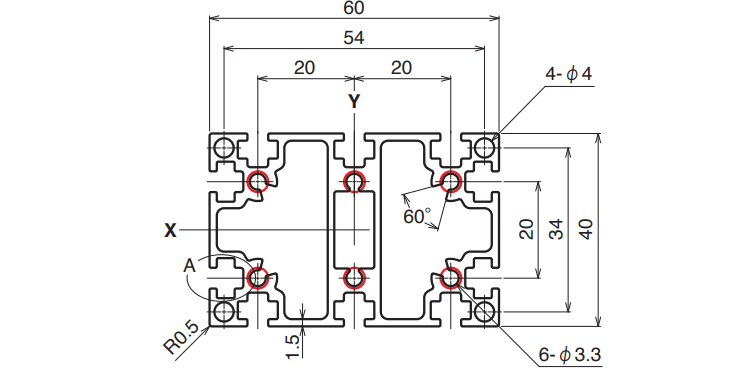 | 6,000 mm | 15–4,000 mm | A6063S-T5 (205) | 225 N/mm² | 668.6 mm² | 1.805 kg/m | Ix 12.0 × 10⁴ mm⁴ Iy 23.8 × 10⁴ mm⁴ |