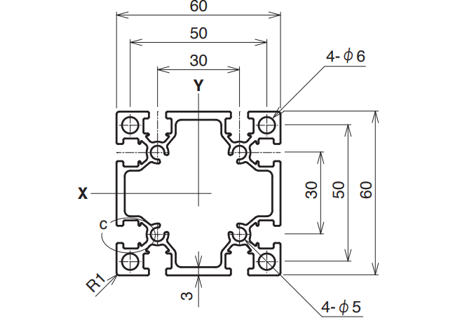 | 6,000 mm | 15–4,000 mm | A6063S-T5 (205) | 225 N/mm² | 876.4 mm² | 2.366 kg/m | Ix 40.21 × 10⁴ mm⁴ Iy 40.21 × 10⁴ mm⁴ |