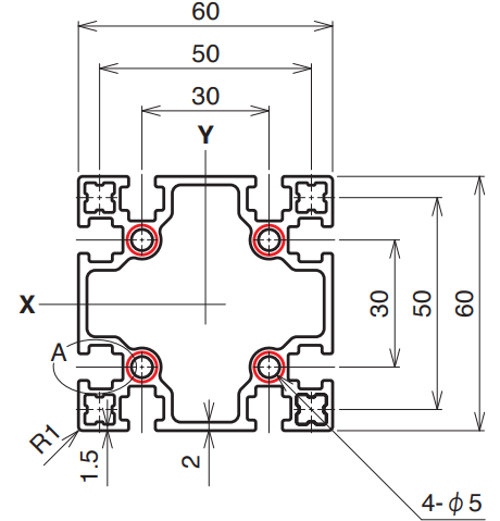 | 6,000 mm | 15–4,000 mm | A6063S-T5 (205) | 225 N/mm² | 892.3 mm² | 2.409 kg/m | Ix 37.3 × 10⁴ mm⁴ Iy 37.3 × 10⁴ mm⁴ |