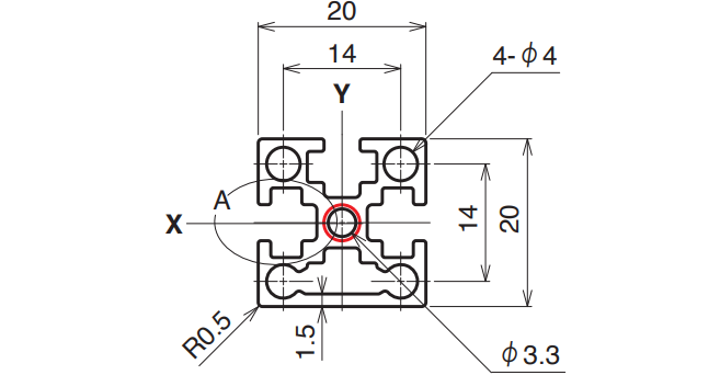 | 6,000 mm | 15–4,000 mm | A6063S-T5 | 185 N/mm² | 163.1 mm² | 0.440 kg/m | Ix 0.66 × 10⁴ mm⁴ Iy 0.62 × 10⁴ mm⁴ |